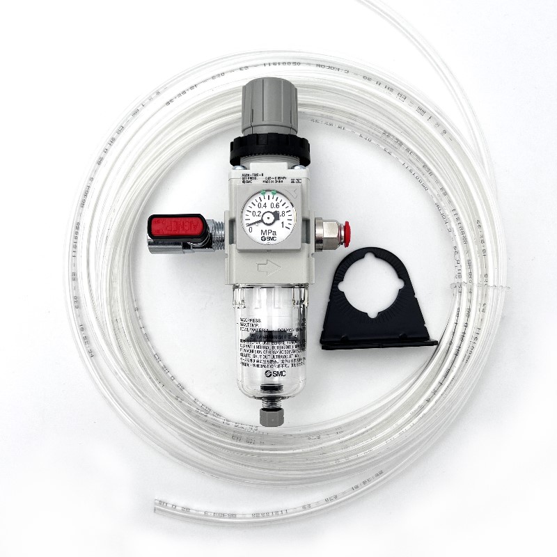 Règle et configure la pression et le débit d’air par un groupe filtre-régulateur, manomètre et vanne sphérique. Kit comprend:Groupe filtre/
